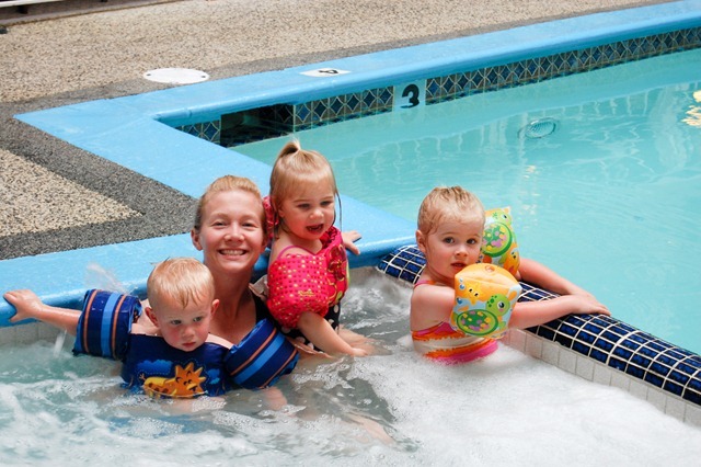 It was COLD but relatively sunny. We decided to stay inside and do some swimming. We went swimming every night, after dinner, and both Brecken and Joelle are quite the water rats. B is quite a bit more daring than Jojo but they were both swimming and floating along without to much assistance.