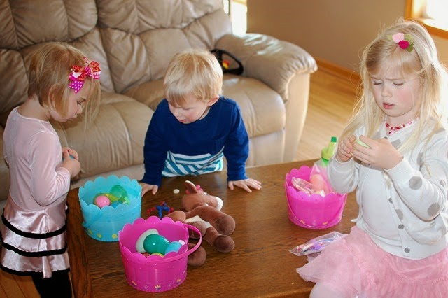 Our Easter started earlier in the week with an Easter party at a friends house. Mary had us all over and told the story of Jesus, had lunch and an Easter egg hunt. The kids each got 12 "things."